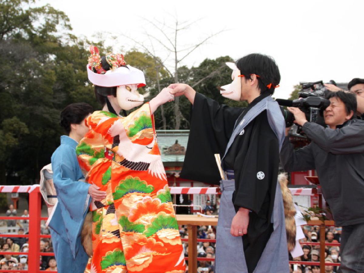 この神事は毎年節分の日におこなわれ、『追儺の鬼はらい』として当神社に古くから伝わる厄祓行事です。当神社の神使、福徳家の娘狐福子が、神使の総本家、助四郎家の小狐助太郎のもとへお嫁入りする・・・・・という道中を新郎新婦はもとより、仲人・親族も正装し再現するものです。神使狐の面と婚礼衣装を着付けた狐の新郎新婦は、赤鬼・青鬼の先導で、嫁入り道具や笛・太鼓の楽人等と共に行列をなし賑やかに練り歩きます。狐の夫婦は境内を一周して特設舞台に上がり、三三九度の盃を交わした後、祝儀袋に入った福餅や福豆を参拝者にまかれます。この狐のカップルは毎年、氏子区域の厄年にあたる方の中から選ばれます。